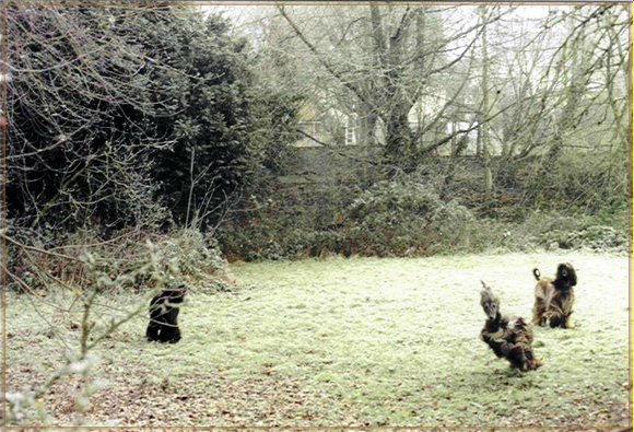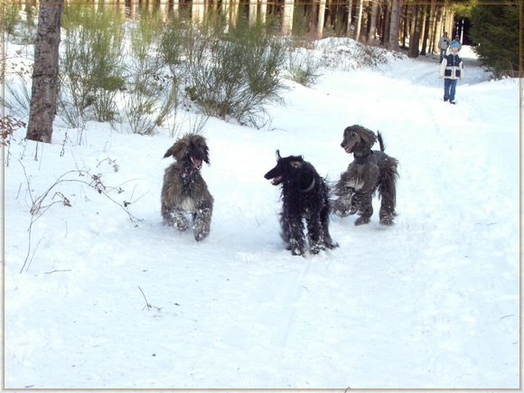 frei laufen dürfen. Our afghan hounds live with us as family dogs. In our big garden they can run and play. We are taking them on long walks - and sometimes they are allowed to run free. |