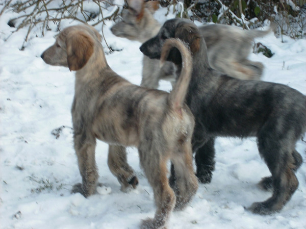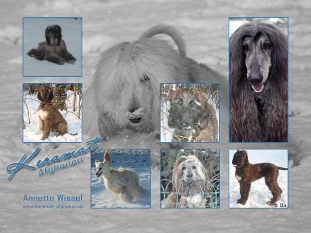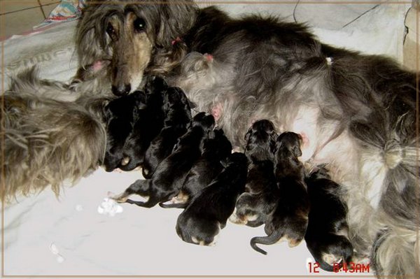 Octobre 12., notre magnifique "Lotte", Agha Djari's Witchcraft, a donné naissance à une petite fille et cinq garcons costauds aux couleurs bleu argent bringés, creme argent bringés et rouge bringés. Voir puppies pages.